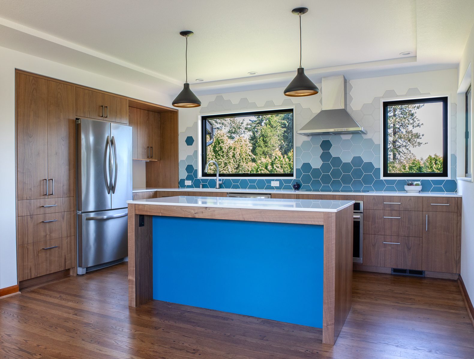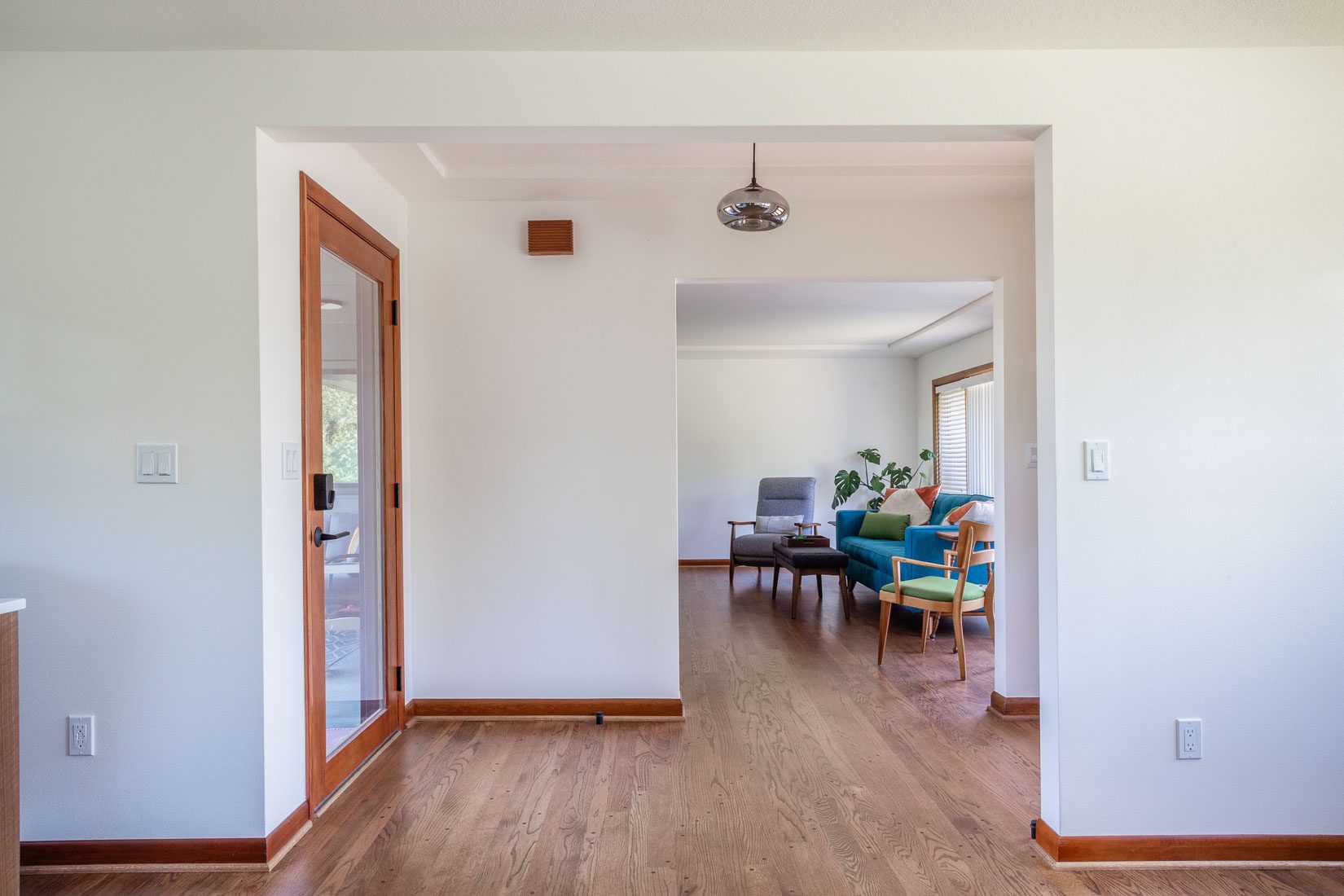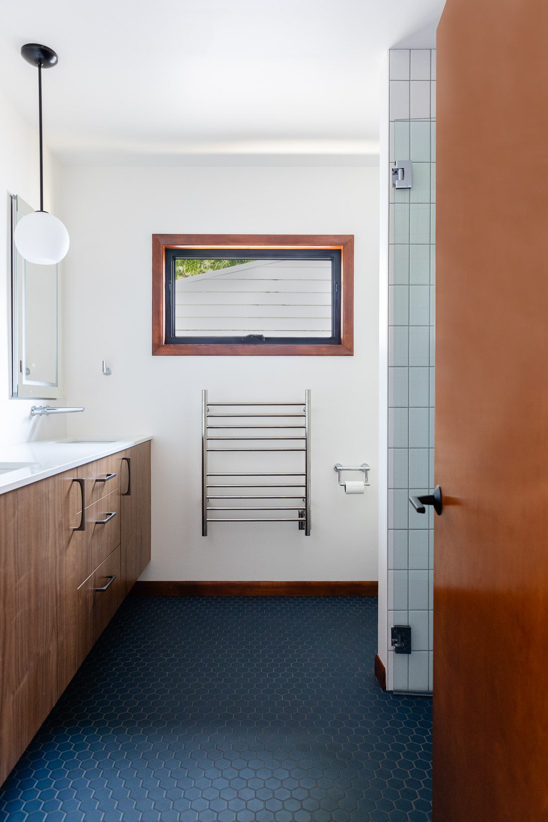 In this reimagined 1950s residence, the heart of the home was reoriented to embrace its natural surroundings. The kitchen—once at the front—was relocated to the rear, opening to sweeping views and daylight. A subtle expansion into the former garage created a light-filled addition with a generous kitchen, mudroom, and powder room. Honoring the home’s mid-century soul, original details were reinterpreted: tray ceilings were recreated, and fir-trimmed doors echo the vintage character, creating harmony between past and present. A vibrant pop of Fireclay Tile adds a playful, retro-inflected touch. To prepare for future lower-level living, a new stairwell was seamlessly integrated into the home’s flow—so natural it feels as if it had always been there. The result is a home that respects its roots while offering fresh, modern ease.